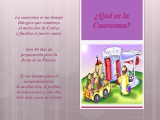 La Cuaresma es un tiempo de 40 días que comienza el Miércoles de Ceniza y finaliza el Jueves Santo, destinado a la reflexión, conversión espiritual y preparación para la Pascua a través del ayuno, la oración, la limosna y el arrepentimiento, con el fin de vivir más cerca de Cristo antes de conmemorar su pasión, muerte y resurrección.