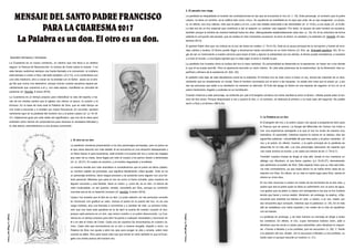 El documento presenta un resumen de tres puntos clave de la parábola del rico y Lázaro contenida en el Evangelio de San Lucas. 1) Lázaro, a pesar de su pobreza y sufrimiento, es un don valioso que debe ser acogido. 2) El rico es ciego a los necesitados debido a que está corrompido por el pecado de la codicia, vanidad y soberbia. 3) La Palabra de Dios, representada por Moisés y los profetas, es el verdadero don que puede conducir