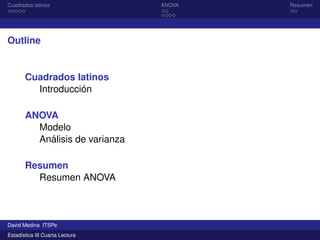 El documento describe el análisis de varianza (ANOVA) para un diseño de cuadrados latinos. Explica que este diseño permite controlar dos fuentes de variación al mismo tiempo agrupando unidades experimentales en bloques de acuerdo a dos factores. Luego resume los pasos del ANOVA, incluyendo la descomposición de la suma de cuadrados totales, la obtención de estimadores independientes de la varianza, y la prueba de hipótesis utilizando la distribución F.