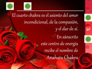 El documento describe el cuarto chakra o chakra del corazón, conocido como Anahata Chakra en sánscrito. Este centro energético es la sede del amor incondicional, la compasión y la generosidad. Una de sus cualidades más hermosas es el amor universal que emana de la fuente divina del amor. Cuando despierta el amor en este chakra, la persona comienza a vivir desde el corazón y a conducir su vida desde la suprema conciencia del amor.