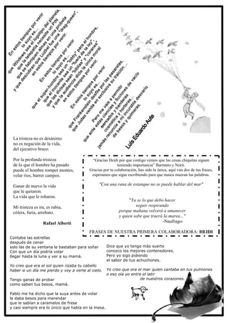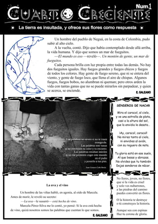 El documento presenta una serie de fragmentos literarios sobre diferentes temas. Un hombre del pueblo de Neguá en Colombia cuenta haber visto desde el cielo que los seres humanos son como fuegos que brillan con luz propia. Otro fragmento habla sobre no envidiar a otros y encontrar la propia gloria. Un tercer fragmento anima a no rendirse ante la crueldad de la vida.