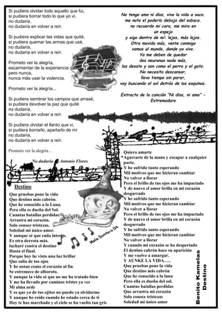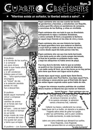 Este documento contiene extractos de varias canciones que hablan sobre temas como los recuerdos del pasado político y social de los años 60-70, la pérdida de la inocencia y las ilusiones de la juventud, la desilusión ante la derrota de los ideales de cambio social, y la continuidad de la injusticia y la violencia en el mundo.