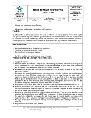 Este documento presenta una ficha técnica de un cuarto frío utilizado para refrigerar frutas y hortalizas. Describe las características físicas, especificaciones técnicas, instrucciones de uso, mantenimiento y procedimientos de limpieza del equipo. El cuarto frío mantiene temperaturas hasta -40°C y se usa para conservar productos agrícolas mediante enfriamiento.