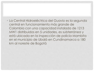 La Central Hidroeléctrica del Guavio es la segunda central más grande de Colombia con una capacidad de 1213 MW distribuidos en 5 unidades hidroeléctricas. Está ubicada de forma subterránea en Mambita, Cundinamarca. Cuenta con una almenara, un pozo y túneles de carga y fuga, así como una caverna de máquinas y transformadores. Utiliza 5 turbinas Pelton de 230 MW cada una. El documento describe los componentes y procesos técnicos de la central.