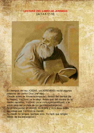 El documento presenta las lecturas para el IV Domingo del Tiempo Ordinario. La primera lectura narra el llamado de Jeremías por Dios para ser profeta. El salmo responsorial expresa la confianza en Dios. La segunda lectura de San Pablo enfatiza que aunque haya dones espirituales, el amor es lo más importante. La lectura del Evangelio según San Lucas describe como Jesús es rechazado en su pueblo natal al recordarles como Dios envió profetas a gentiles y no a judíos en tiempos pasados.