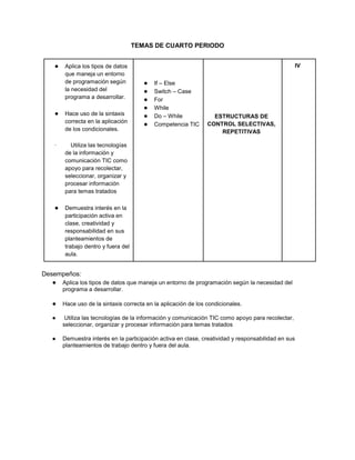 El documento habla sobre estructuras de control selectivas y repetitivas como if-else, switch-case, for, while y do-while. También cubre competencias TIC como aplicar tipos de datos según la necesidad del programa, usar la sintaxis correcta de condicionales, y utilizar tecnologías para recolectar, seleccionar, organizar e información. Se enfatiza la participación activa, creatividad y responsabilidad.