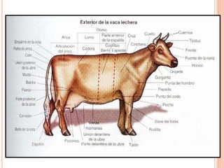 El documento describe las características ideales de las vacas lecheras de diferentes razas para producir leche. Describe las cuñas laterales, frontales y dorsales que indican la capacidad del abdomen y tórax. Las principales razas lecheras son Holstein-Friesian, Ayrshire, Brown Swiss, Guernsey y Jersey. El Holstein ideal se evalúa en seis aspectos: apariencia general, temperamento lechero, capacidad, patas y pezuñas, sistema mamario y anca.