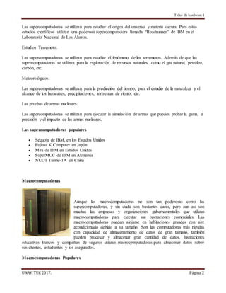 El documento describe cuatro tipos principales de computadoras: supercomputadoras, macrocomputadoras, minicomputadoras y microcomputadoras. Las supercomputadoras son las más poderosas y se usan para investigación científica compleja como la exploración espacial. Las macrocomputadoras son menos potentes que las supercomputadoras pero aún grandes y se usan en empresas y gobiernos. Las minicomputadoras son más pequeñas y se usan en pequeñas empresas. Las microcomputadoras incluyen computadoras personales,