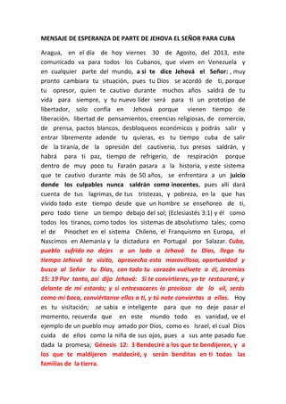 Este documento ofrece un mensaje de esperanza para Cuba, indicando que pronto cambiará su situación opresiva. Dice que Cuba será liberada de su tiranía y sus líderes actuales pasarán a la historia. Exhorta a Cuba a confiar en Dios y no adorar ídolos como hizo Israel antiguamente. Aconseja a los líderes cumplir con las leyes y no abusar de su poder, pues serán juzgados por Dios.