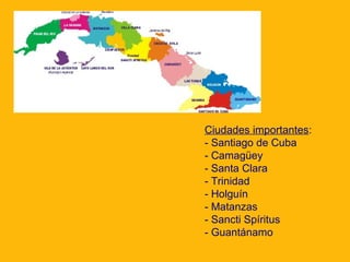 Cuba es una isla en el Caribe con una superficie de 110,922 km2. La capital y ciudad más grande es La Habana. Cuba tiene una población de 11.5 millones de habitantes y su forma de gobierno es un estado socialista. Algunas de sus ciudades importantes incluyen Santiago de Cuba, Camagüey, Santa Clara y Trinidad. La historia de Cuba incluye una etapa precolombina, la colonización española en el siglo XVI, y la revolución cubana en la década de 1950 que estableció un gobierno socialista