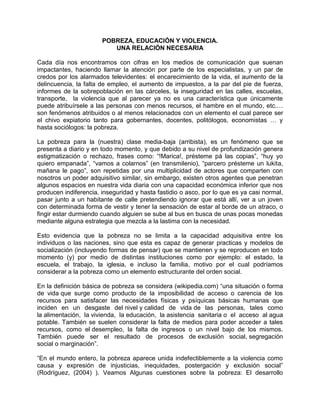 El documento analiza la relación entre pobreza, educación y violencia, proponiendo una definición multidimensional de la pobreza que va más allá de lo económico. Se discuten diversas metodologías e índices para medir la pobreza y sus implicaciones sociales, así como el impacto de la pobreza en la violencia y desarrollo humano. Además, se cuestionan las estrategias gubernamentales para combatir la pobreza y la efectividad de los índices utilizados para medirla.