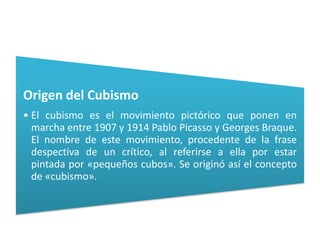 El cubismo fue un movimiento artístico desarrollado entre 1907 y 1914 por Pablo Picasso y Georges Braque. Rompió con la perspectiva renacentista al representar objetos desde múltiples puntos de vista en una sola imagen. Se distinguen dos etapas: el cubismo analítico descompuso objetos en planos múltiples con tonos terrosos, mientras que el cubismo sintético volvió a la claridad y el colorido. Picasso y Braque fueron sus principales exponentes.