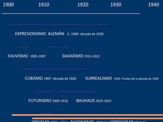 El documento describe los principales movimientos de vanguardia artística que surgieron en Europa entre 1900 y 1940, incluyendo el fauvismo, el expresionismo, el cubismo, el futurismo y el surrealismo. Se enfoca en explicar el cubismo, dividido en tres fases: científico, órfico y sintético. El cubismo rompió con la perspectiva tradicional y la representación naturalista a través de la fragmentación de formas y el uso de múltiples puntos de vista. Artistas clave del cubismo fueron Pablo Picasso, Georges