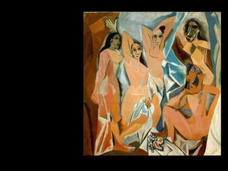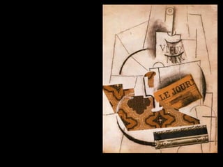 El cubismo surgió en Francia en 1907 y fue acuñado por Louis Vauxcelles. Representantes clave fueron Pablo Picasso, George Braque y Juan Gris. El cubismo rompió con la perspectiva monofocal tradicional y representó objetos desde múltiples puntos de vista simultáneos, disolviendo el volumen y la independencia de planos. Se inspiró en Cézanne y utilizó una paleta reducida, collage, geometría y formas como conos y cilindros. Apollinaire distinguió tres etapas: cient