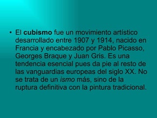El cubismo fue un movimiento artístico desarrollado entre 1907 y 1914 en Francia por Pablo Picasso, Georges Braque y Juan Gris. Rompió con la perspectiva tradicional al representar objetos desde múltiples ángulos en una sola imagen usando formas geométricas. Se distinguen tres etapas: cubismo cezaniano con formas identificables, cubismo analítico con descomposición geométrica de figuras, y cubismo sintético con reducción de figuras a sus formas geométricas más puras.