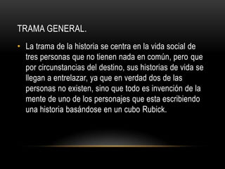 Este documento presenta una sinopsis de 8 capítulos para una historia dramática. Presenta 3 personajes principales con historias entrelazadas: Raúl, un joven solitario y oscuro; Bárbara, una chica popular pero con una vida secreta; y Sebastián, un tipo creativo. Los capítulos detallan las vidas separadas de los personajes y cómo sus caminos eventualmente se cruzan, explorando temas como la soledad, las apariencias engañosas y las luchas internas.