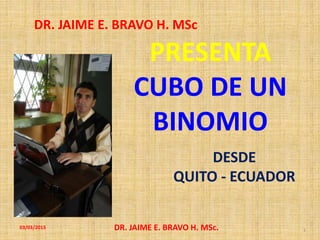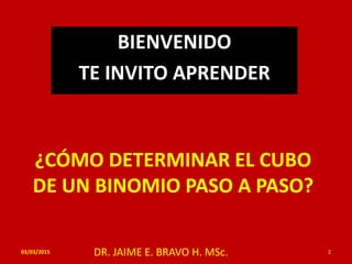 Este documento presenta un método paso a paso para determinar el cubo de un binomio. Explica que el cubo de la suma o diferencia de dos términos es igual al cubo del primer término más o menos el triple producto del cuadrado del primer término por el segundo, más el triple producto del primero por el cuadrado del segundo más o menos el cubo del segundo término. Aplica esta regla a varios ejemplos y luego invita al lector a practicar resolviendo el cubo de más binomios.