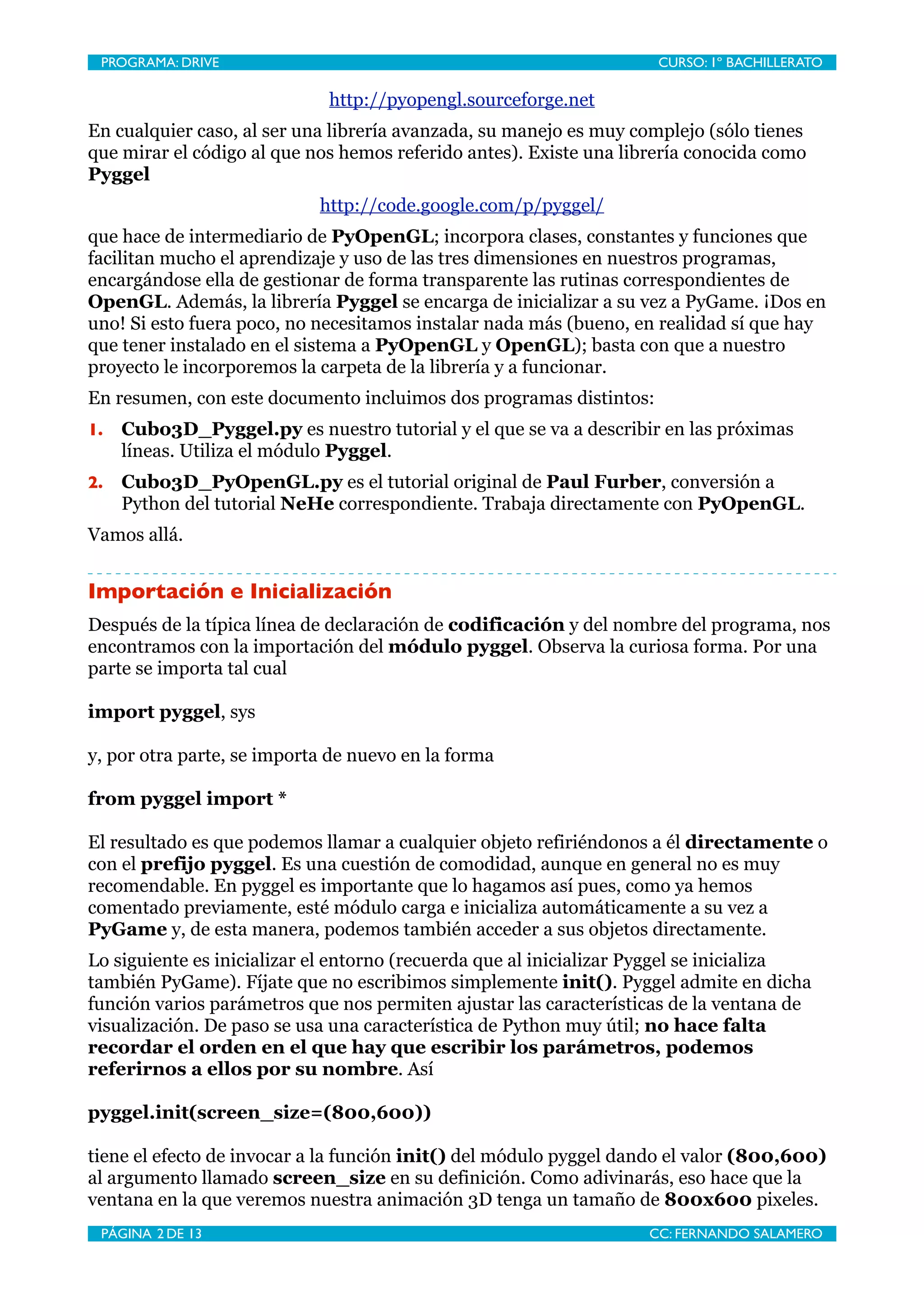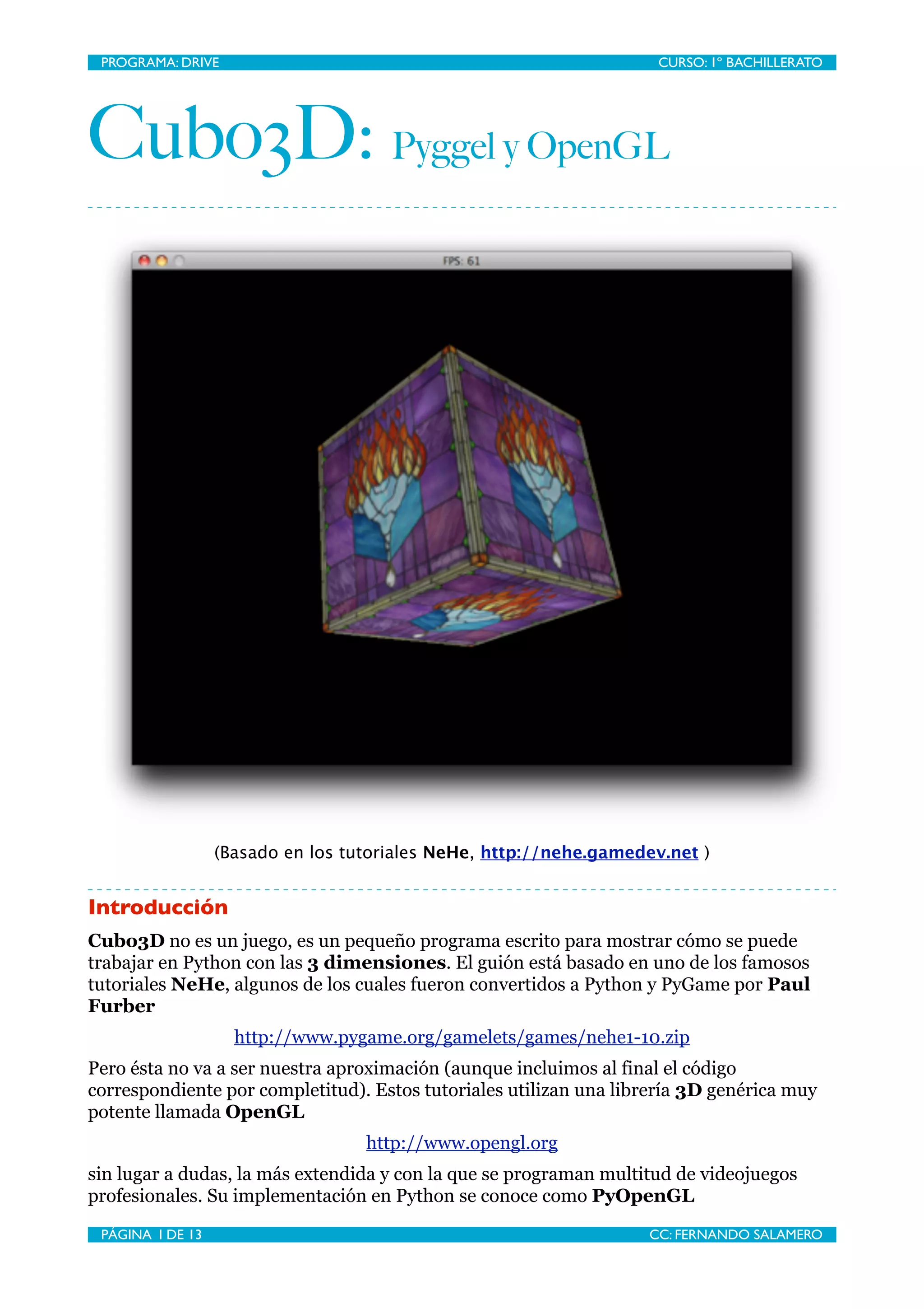El documento presenta un tutorial sobre cómo utilizar las librerías Pyggel y OpenGL para crear un programa en Python que muestra un cubo en 3D. Se describen los pasos necesarios para configurar el entorno, crear una escena tridimensional y gestionar luces y cámaras. También se incluye un código de ejemplo que ilustra cómo implementar lo aprendido en el tutorial.