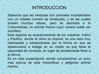 Este documento proporciona información sobre la cubomedusa, un animal marino venenoso. Explica la taxonomía, morfología, anatomía, fisiología y dieta de la cubomedusa. Se detalla que vive en aguas tropicales y subtropicales de Australia y Filipinas, que su cuerpo está formado principalmente por agua, y que se alimenta de zooplancton y pequeños peces usando sus venenosos tentáculos.