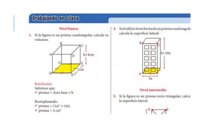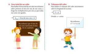 El documento explica cómo calcular el área y el volumen de un cubo. Proporciona ejemplos para cubos con lados de longitud 3 y 7, encontrando que el área es 54 y 294 respectivamente, y el volumen es 27 y 343 respectivamente. Luego asigna como tarea calcular el área y volumen para cubos con lados de longitud 2, 5, 4, 8 y 11.