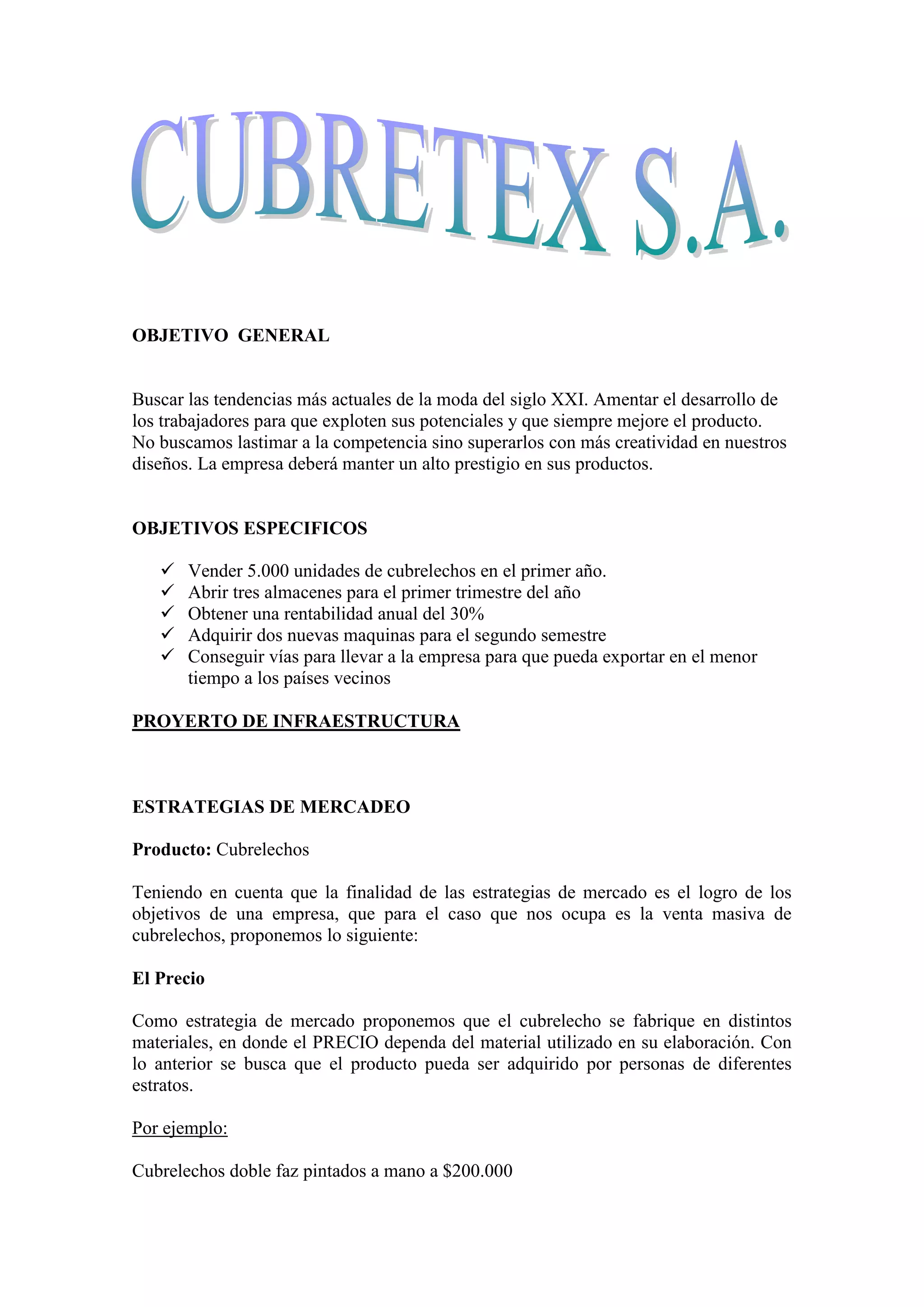 El documento presenta los objetivos y estrategias de mercadeo de una empresa dedicada a la fabricación y venta de cubrelechos. Los objetivos generales son buscar las tendencias de moda actuales y mejorar el desarrollo de los trabajadores. Los objetivos específicos son vender 5,000 unidades en el primer año, abrir 3 tiendas nuevas en el primer trimestre, obtener una rentabilidad anual del 30% y adquirir nuevas máquinas en el segundo semestre. Las estrategias de mercadeo incluyen ofrecer diferentes precios según