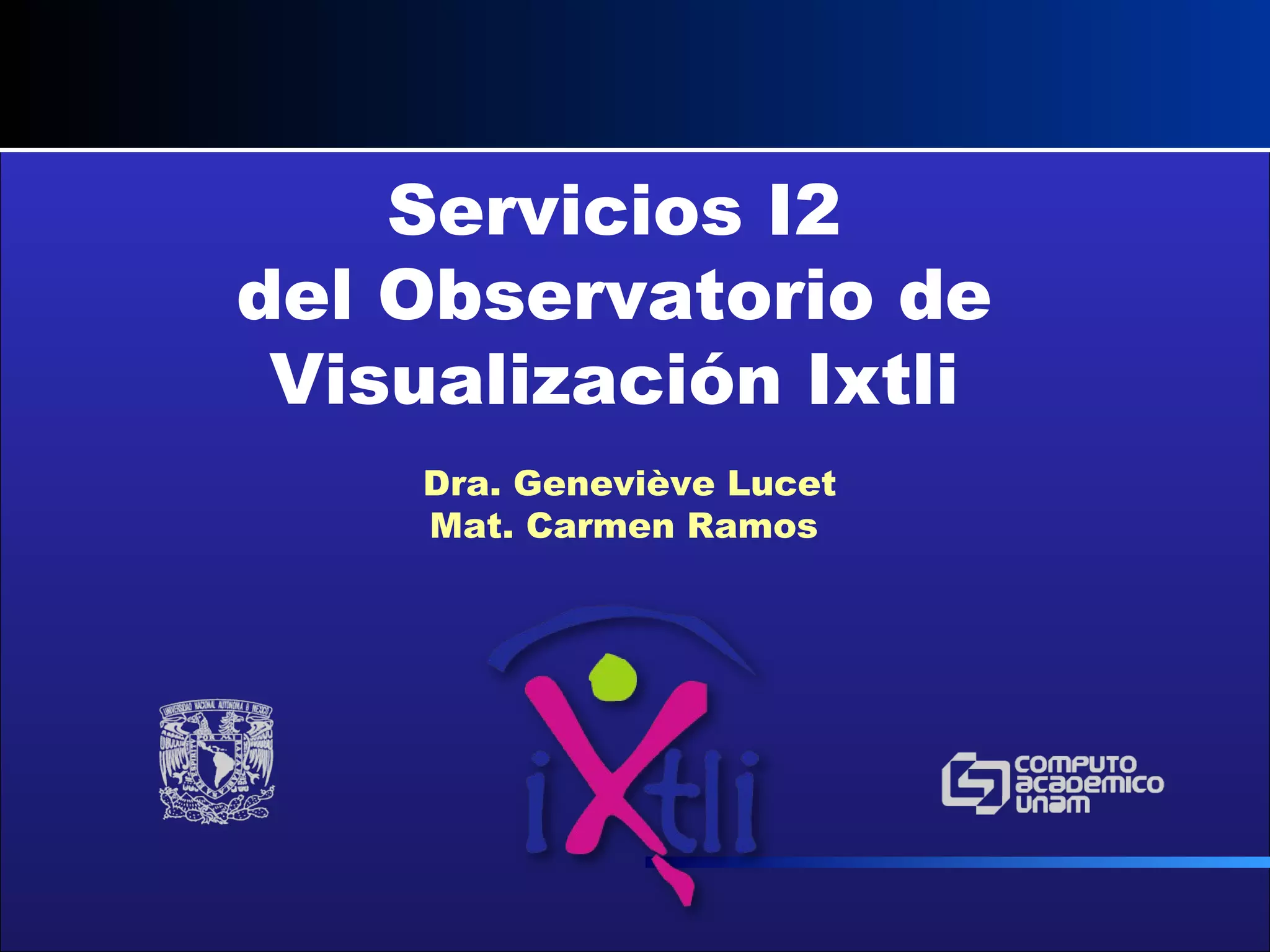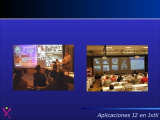El documento describe las capacidades del Observatorio de Visualización Ixtli para realizar colaboración a distancia entre múltiples usuarios. Propone el desarrollo de herramientas que permitan la navegación, modificación y diseño compartidos de ambientes 3D, así como la integración de avatares y sincronización de acciones entre usuarios. También recomienda la creación de un AccessGrid en Ixtli, el cual permitiría reuniones colaborativas compartiendo aplicaciones y datos generados al trabajar con una red grid de recursos computacionales