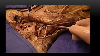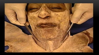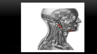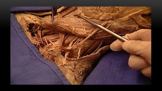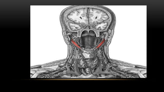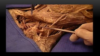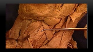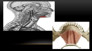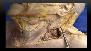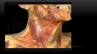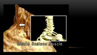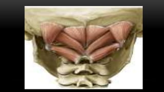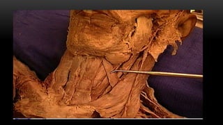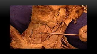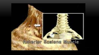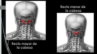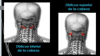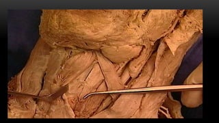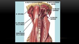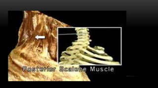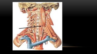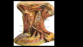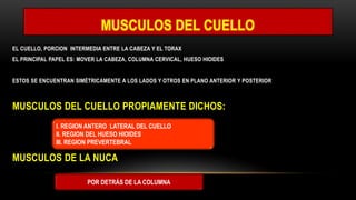 Este documento describe los músculos del cuello. Se dividen en cuatro regiones: anterolateral, prevertebral, hueso hioides y posterior. En la región anterolateral se encuentran el platisma, esternocleidomastoideo, escalenos y recto lateral de la cabeza. La región prevertebral incluye los músculos rectos mayores y menores. Alrededor del hueso hioides están los músculos infra e suprahioideos. Finalmente, la región posterior comprende los esplenios, complejo mayor,
