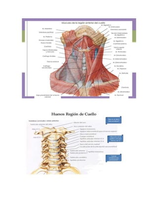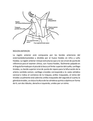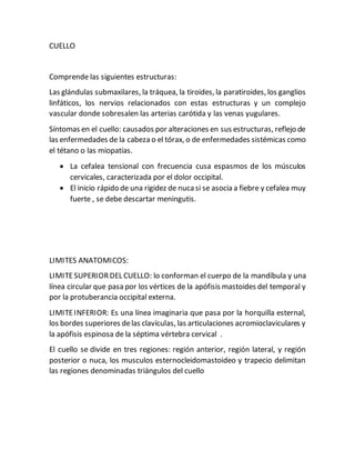 El documento describe la anatomía del cuello, incluyendo sus estructuras principales como las glándulas, tráquea, tiroides y vasos sanguíneos. Explica los pasos para examinar el cuello, como inspeccionar la forma y movilidad, y palpar ganglios linfáticos, la tiroides, las carótidas y la vena yugular. También describe alteraciones comunes del cuello como adenopatías, quistes y cambios en el tamaño de la tiroides.