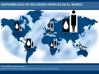 El documento describe los recursos hídricos más importantes de la Tierra como el agua, los lagos, ríos y aguas subterráneas. Explica que los ríos son corrientes de agua que son muy importantes para el ser humano como fuente de agua, energía, transporte y alimentación. Además, define una cuenca hidrográfica como el territorio por el que discurre un río y sus afluentes, y explica que el manejo de cuencas es importante para regular el recurso hídrico y proteger los ecos