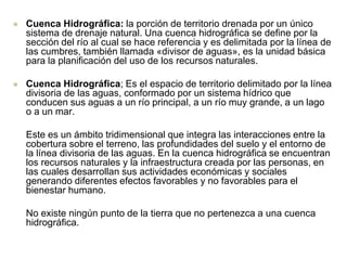 Este documento describe las características de las cuencas hidrográficas. Define una cuenca hidrográfica como la porción de territorio drenada por un único sistema de drenaje natural. Explica que las cuencas pueden clasificarse por su tamaño, ecosistema, objetivo, relieve o dirección de evacuación de aguas. También describe las funciones ambientales, ecológicas, hidrológicas y socioeconómicas de las cuencas. Finalmente, explica que una cuenca hidrográfica puede dividirse
