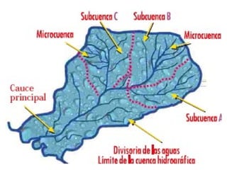 El documento describe la cuenca hidrográfica como una unidad territorial esencial para la gestión de recursos naturales, definida por la línea de cumbres y con un sistema hídrico que drena hacia un río, lago o mar. Se analizan diferentes clasificaciones de cuencas según tamaño, ecosistema, objetivo y relieve, así como sus funciones ambientales, ecológicas, hidrológicas y socioeconómicas. Además, se explican los componentes y partes de una cuenca, y se menciona la importancia del ciclo hidrológico y sus características morfométricas para el balance del agua.