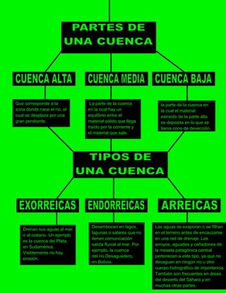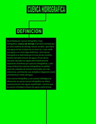 Una cuenca hidrográfica se define como el territorio drenado por un único sistema de drenaje natural que vierte sus aguas al mar a través de un río o a un lago interior. Se delimita por las divisorias de aguas y permite regular el uso de recursos naturales y una integración territorial a través del agua. Mientras que una cuenca hidrográfica se refiere al agua superficial, una cuenca hidrológica incluye también las aguas subterráneas.