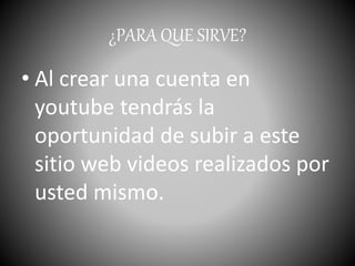 Este documento explica cómo crear una cuenta en YouTube y subir videos. Detalla los pasos para crear una cuenta, que incluyen proporcionar información personal y confirmar la dirección de correo electrónico. Luego explica cómo subir un video seleccionando el archivo de video, proporcionando un título, descripción y etiquetas, y finalmente publicándolo en la plataforma. El objetivo final es que los usuarios publiquen sus propios videos en YouTube.