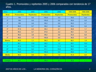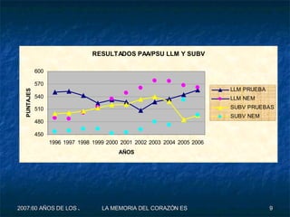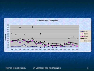 El documento presenta datos sobre el rendimiento académico del Liceo Leonardo Murialdo entre los años 2005 y 2006. Reporta tasas de repitencia y promoción por curso y nivel, resultados en las pruebas SIMCE y PSU comparados con promedios nacionales, y conclusiones sobre áreas de mejora como repitencia en enseñanza media y resultados en la PSU.