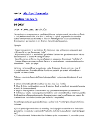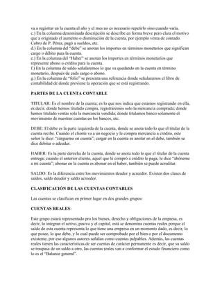 El documento define una cuenta contable como un medio para subdividir y agrupar elementos del activo, pasivo y capital de acuerdo a ciertas características. Explica que el nombre y contenido de las cuentas varían según la empresa y el sistema contable utilizado. Las cuentas tienen partes como el titular, debe, haber y saldo, y se clasifican en cuentas reales, nominales, mixtas y de orden.