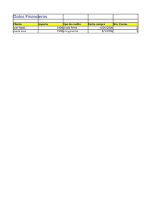 El documento presenta datos financieros de tres clientes, incluyendo el importe de sus créditos, el tipo de crédito, la fecha de compra, el número de cuotas, el importe de cada cuota, el IVA y el total a pagar. Los clientes son Juan López, María Sosa y José Rosas, con importes de $3,400, $2,500 y $750 respectivamente.