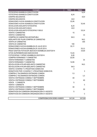 El documento contiene registros de transacciones financieras de varias fechas entre el 20 de junio y el 1 de agosto. Los registros incluyen conceptos como adelantos a miembros, compra de material de oficina, donaciones para asambleas, venta y compra de camisetas y entradas para comidas.