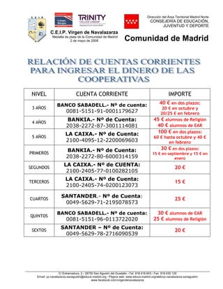Este documento proporciona información sobre las cuentas bancarias y los importes de las cuotas escolares para cada nivel educativo en el C.E.I.P. Virgen de Navalazarza. Se especifican los bancos, números de cuenta y los importes a pagar trimestralmente o semestralmente para los niveles de 3 a 6 años de primaria.
