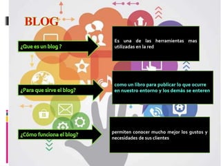 Una wiki es un sitio web colaborativo donde los usuarios pueden crear y editar contenido de forma rápida y eficaz, permitiendo conocer mejor los gustos y necesidades de los clientes. Slideshare es un sitio web 2.0 donde los usuarios pueden subir y compartir presentaciones de forma pública o privada a través de un enlace.