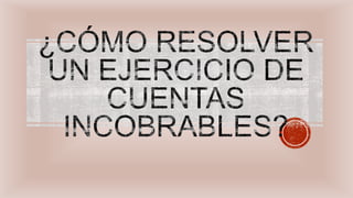 El documento explica cómo calcular la provisión para cuentas incobrables para una cuenta de clientes con un saldo de Q223,000. Primero, se determina que el porcentaje de cuentas incobrables según la ley es 3%. Luego, se multiplica el saldo de clientes por 3% para obtener un valor de cuentas incobrables de Q6,690. Finalmente, se registra una partida contable para transferir este monto a la cuenta de provisión para cuentas incobrables.