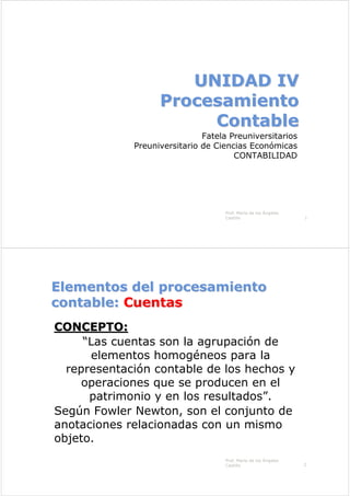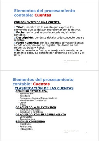 Este documento describe los elementos del procesamiento contable, incluyendo cuentas, plan de cuentas y manual de cuentas. Explica que las cuentas son la agrupación de elementos homogéneos para representar hechos y operaciones, y describe los componentes, clasificaciones y reglas básicas de las cuentas. También define el plan de cuentas como el ordenamiento de todas las cuentas de una empresa, y el manual de cuentas como las normas escritas sobre el contenido y uso de cada cuenta.
