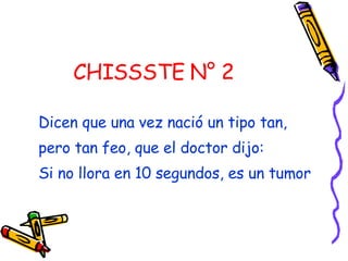 CHISSSTE N° 2 Dicen que una vez nació un tipo tan, pero tan feo, que el doctor dijo: Si no llora en 10 segundos, es un tumor
