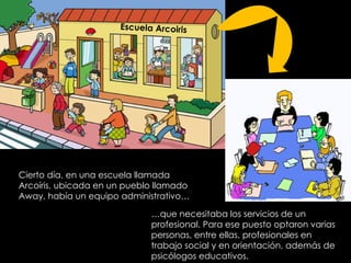 El documento describe cómo una escuela llamada Arcoíris necesitaba contratar a un profesional y varias personas se postularon, incluyendo psicólogos educativos, orientadores y trabajadores sociales. Los psicólogos educativos querían ayudar a los estudiantes con problemas académicos y de conducta. Los orientadores querían brindar apoyo en aprendizaje, vocación y a los docentes. Los trabajadores sociales querían promover el desarrollo integral de los estudiantes. Aunque parecía que el puesto sería para un ps