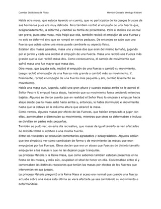 El cuento describe las interacciones entre las masas y las fuerzas en el reino de la Reina Masa. Las masas jugaban libremente hasta que las fuerzas comenzaron a empujarlas, cambiando sus movimientos, deformándolas e incluso rompiéndolas. La princesa Materia aprendió que los efectos de las fuerzas dependen de su tamaño y de la región sobre la que actúan. Aunque las fuerzas pueden ser bruscas, las masas disfrutan interactuando con ellas.