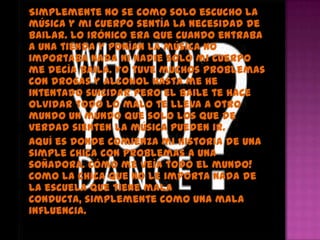 La autora siempre ha sentido la necesidad de bailar para escapar de sus problemas personales como las drogas y el intento de suicidio. Aunque al principio enfrentó dificultades y maltrato en su academia de baile, como el maestro que la marginaba y los compañeros que la empujaban, no se rindió y siguió practicando para cumplir su sueño. Inspirada por las últimas palabras de su madre enferma, retomó el baile y demostró su talento, convirtiéndose ahora en una bailarina profesional que anim