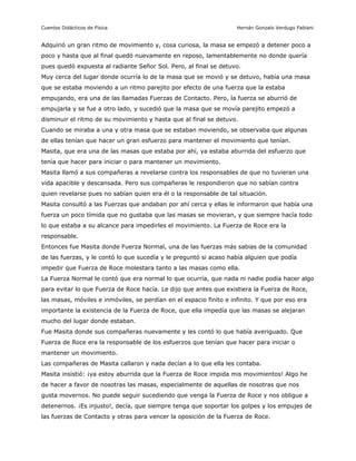 Este cuento describe las quejas de una masa llamada Masita sobre la Fuerza de Roce, que siempre se opone a sus movimientos y la obliga a detenerse. Masita decide ir a quejarse con la Reina Masa. La Reina explica que la Fuerza de Roce es necesaria para evitar que las masas se pierdan en el espacio. Gracias a la Fuerza de Roce, las masas ahora pueden moverse y detenerse de forma controlada. Masita acepta esto y decide llevarse mejor con la Fuerza de Roce.