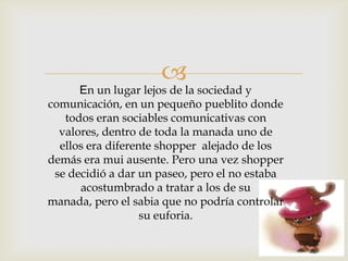 El documento habla sobre un miembro de una manada que era diferente y solitario. Un día decidió unirse a la sociedad pero cometió el error de alterar a un extraño al tratar de conversar. Más tarde se dio cuenta de su error, se disculpó y así pudo formar parte de la comunicativa y respetuosa comunidad con valores.