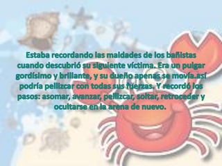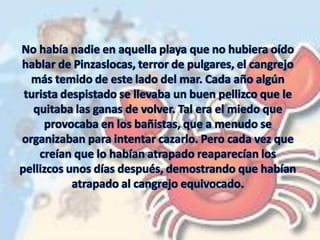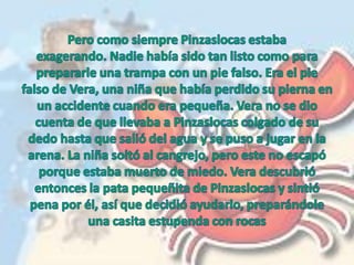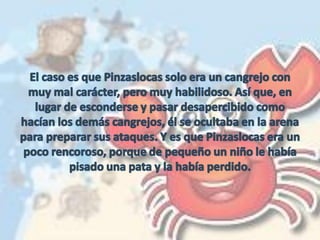 Pinzaslocas, un cangrejo, se atascó al tratar de atrapar a Alondra, una gaviota con una pierna. Al darse cuenta que Alondra tenía una discapacidad, Pinzaslocas decidió cambiar su actitud y ser más alegre y jugar con los demás animales de la playa. La historia enseña a no guardar rencor y a apreciar la suerte que se tiene.