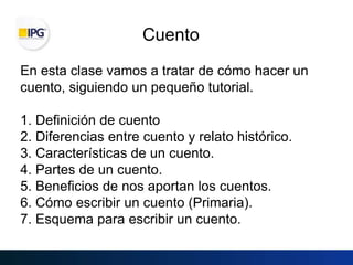 Este documento presenta un tutorial para escribir cuentos. Explica que un cuento es una narración breve ficticia que entretiene o instruye, y diferencia cuentos de relatos históricos. Luego, describe las partes de un cuento, los beneficios de los cuentos para los niños, y un esquema de seis pasos para escribir un cuento propio.