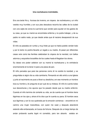 Este documento narra la historia de un niño pobre que intenta vender conos en víspera de Navidad para comprarle un regalo a su madre enferma. Al no poder vender todo, el niño se pone triste y entra a una iglesia a llorar. Ahí conoce a un hombre rico que también cuenta su historia de abandono. Se dan cuenta que son padre e hijo, y juntos van a buscar a la madre para iniciar una nueva vida sin angustias ni temores.